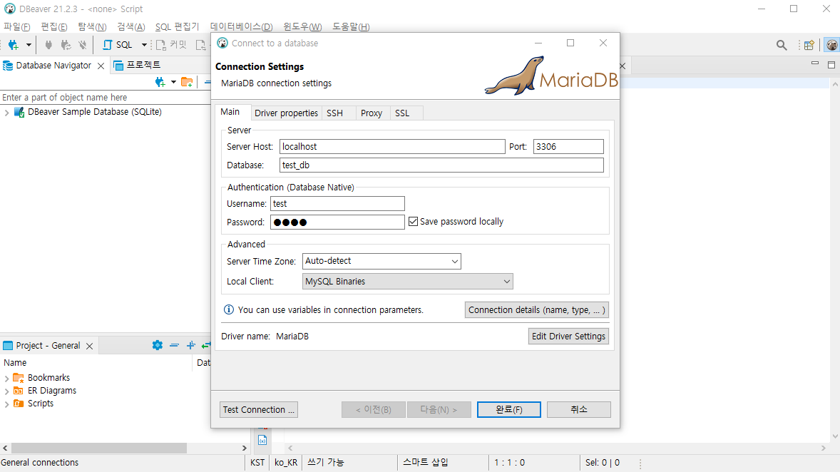 그리고 생성했던 테스트 디비인 test_db를 입력하고