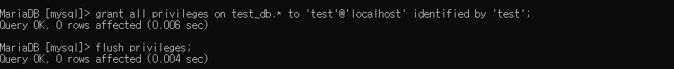 grant all privileges on test_db.* to 'test'@'localhost' identified by 'test';