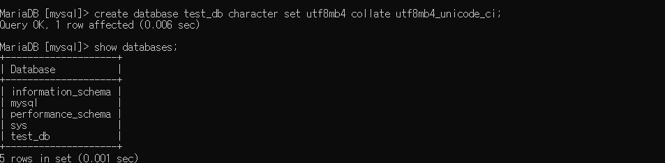 create database test_db character set utf8mb4 collate utf8mb4_unicode_ci;