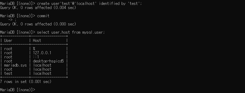 나중에 해당 사용자는 원격디비툴로 주로 접속하기에 아래 test계정 하나만 남기는 것이
