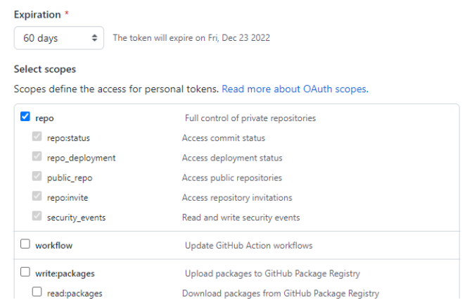 토큰을 생성할 때 몇가지 옵션이 있는데 중요한 점은 Expiration에 No expiration을 선택하여 기간없이 사용하도록 설정하는 것이다.