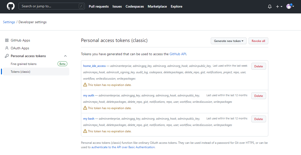 좌측 메뉴 중 Tokens(classic)을 다시 선택하면 우측화면 상단에 Generate new token 이 보일 것이다.