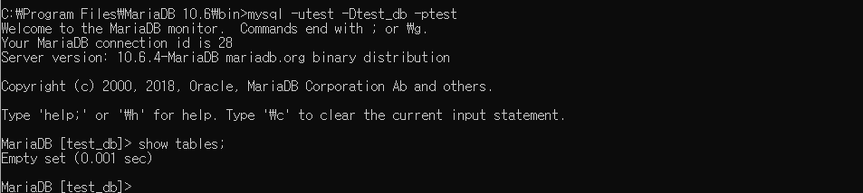 그리고 생성했던 테스트 디비인 test_db를 입력하고
