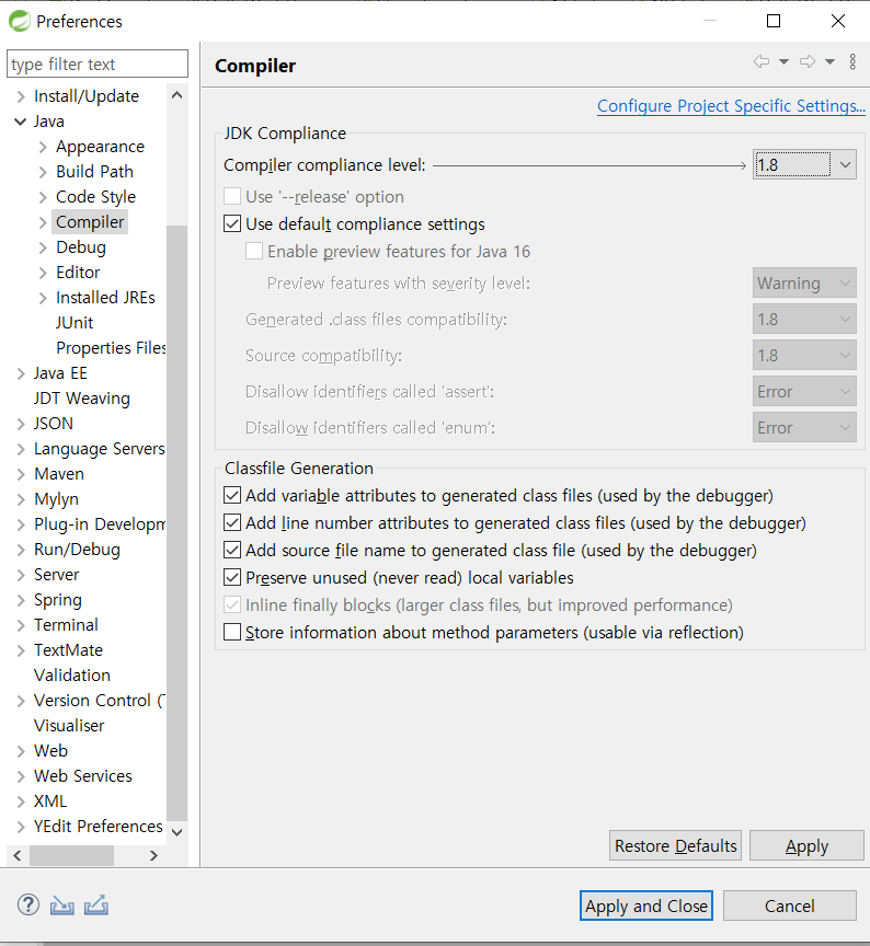 이클립스 상단 메뉴 중 window>Preferences 에서 아래 Java>Compile 메뉴에서 1.8로 맞추어 주자