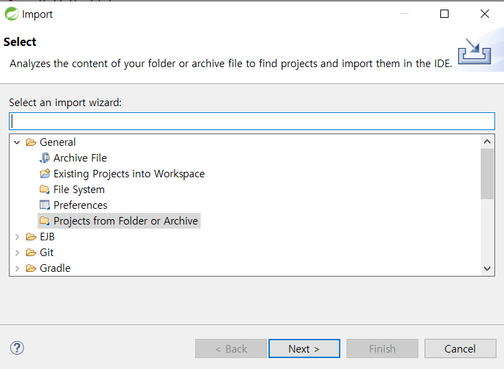 외부 프로젝트파일이나 자바파일등을 이클립스에서 import 로 가져올 때는 아래 옵션으로 가져오면 된다.