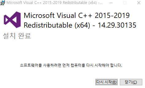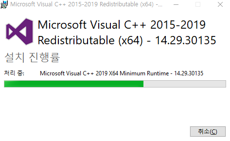 먼저 VS 부터 설치해보자 (다운받은 VC_redist.x64.exe 을 실행한다)
