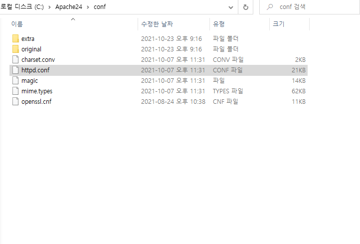 /conf 디렉토리에서 httpd.conf 파일을 수정하겠습니다