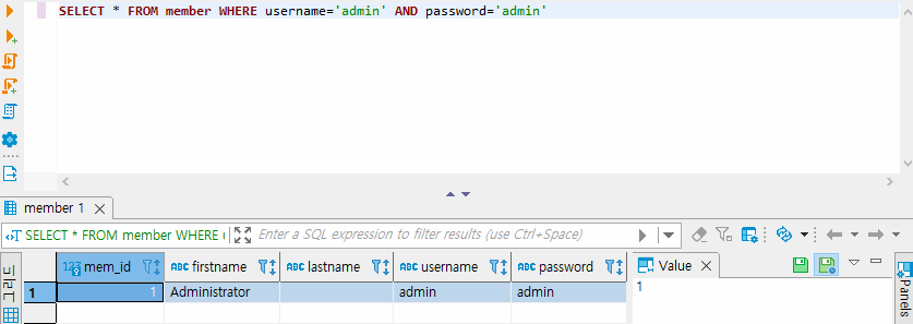 여기에 있는 sql 문장은 보이는 그대로 member테이블에서 넘어온 username과 password 데이터를 ? 에 대입하여 값이 있는지 없는지 확인합니다. 즉 여기서 만약 username이 'admin' 이고 패스워드가 'admin'이라고 가정한다면