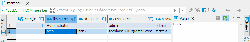 아래의 password 컬럼에도 비밀번호가 그대로 노출되어 보이는데요 실제 이렇게 코딩하면 나중에 보안취약점에 걸려서 재개발할 수도 있으니 이것도 MD5나 기타 암호화모듈을 생각하여 추가수정 개발해보세요