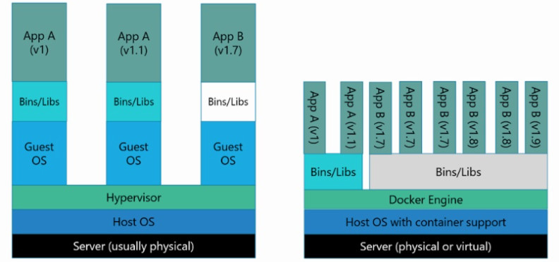 위의 그림중 좌측에 있는 VM은 우리가 알다시피 Host OS위에 가상화를 위한 하이퍼바이져(Hypervisor)기술을 이용합니다. 그런데 그위에 다시 Guest OS를 올려서 사용하는 것이 문제입니다. 한개 정도 돌리는 것은 문제가 안되나 기업용 서버에서 다수의 서버가상화가 필요할 경우 VM은 사실상 사용하기가 어렵다고 볼 수 있습니다.