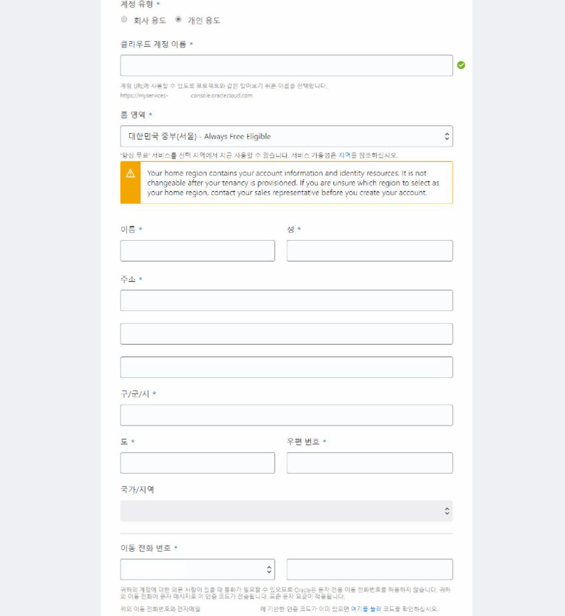 회원 가입시 특이사항만 몇가지 오라클 클라우드는 한국에 seoul과 chunchun에 벌써 2개나 리젼(region)이 있습니다.
