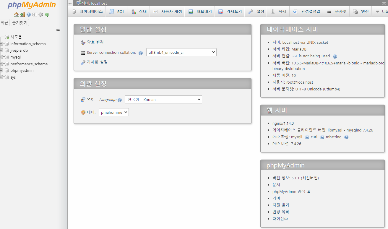 브라우져 접속은 http://도메인 또는 IP/phpmyadmin 가 되겠습니다.