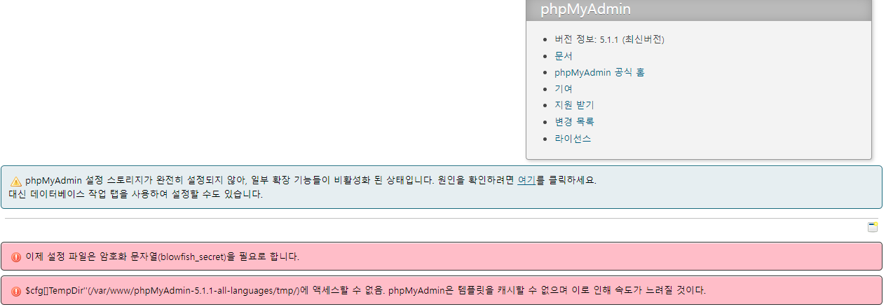 이것은 phpMyAdmin 설정파일인 config.inc.php의 blowfish_secret값이 정해져 있지 않아서 발생
