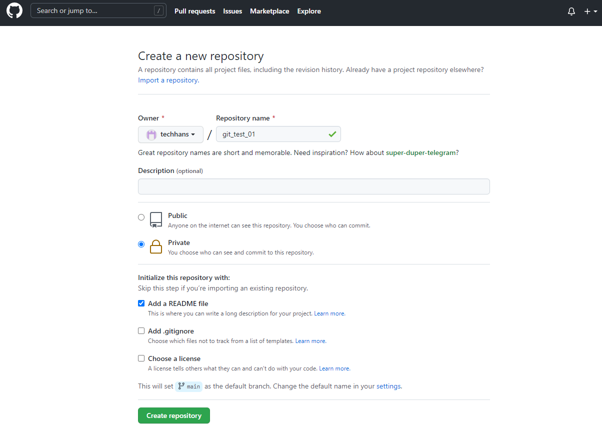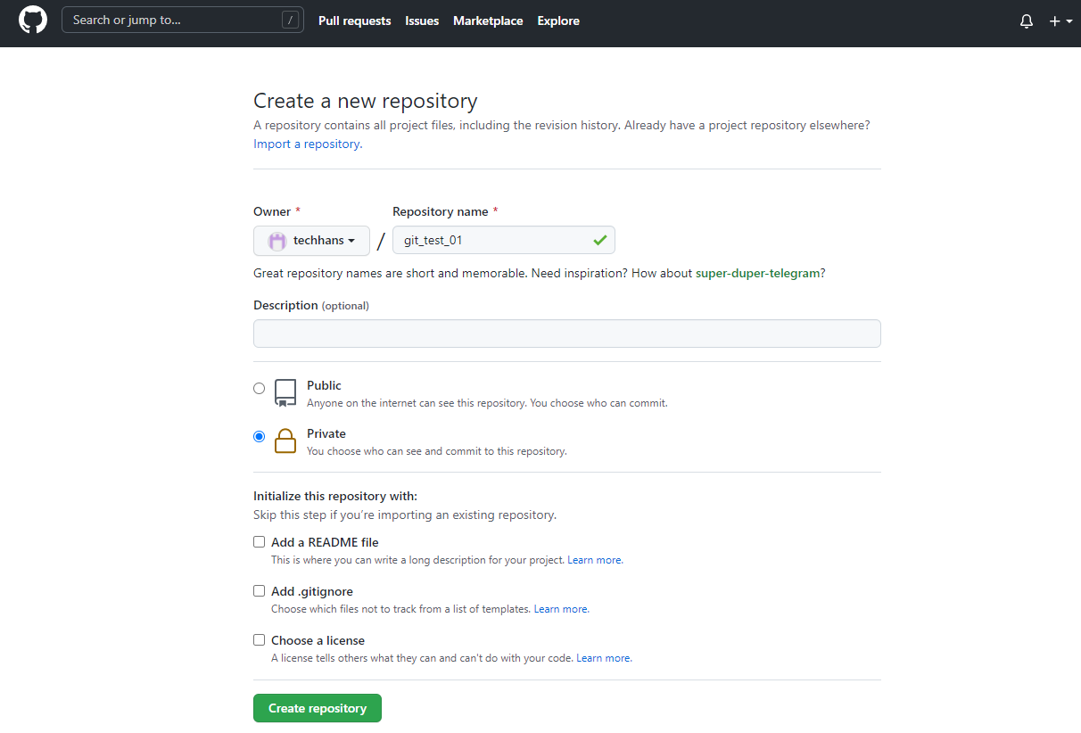 (2-1) readme 파일을 언체크(uncheck) 하고 레파지토리를 생성하는 경우