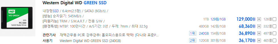 가성비를 보자면 그냥 120기가 wd 사는게 가격이 비슷해 보입니다.