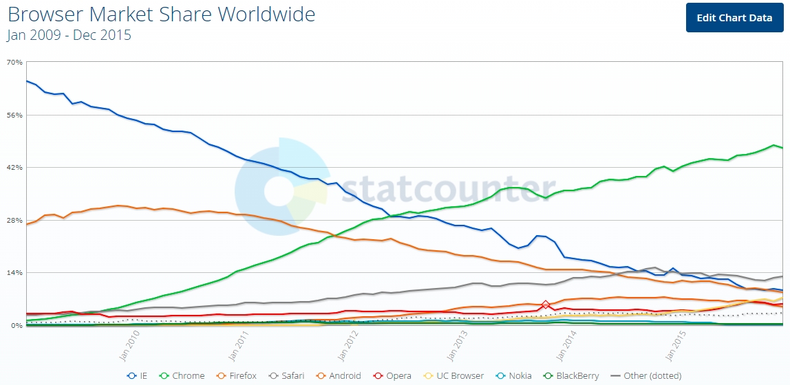 2009년부터 2015년까지 IE에서 chrome으로 사용자의 마켓셰어를 확인할 수 있습니다.
