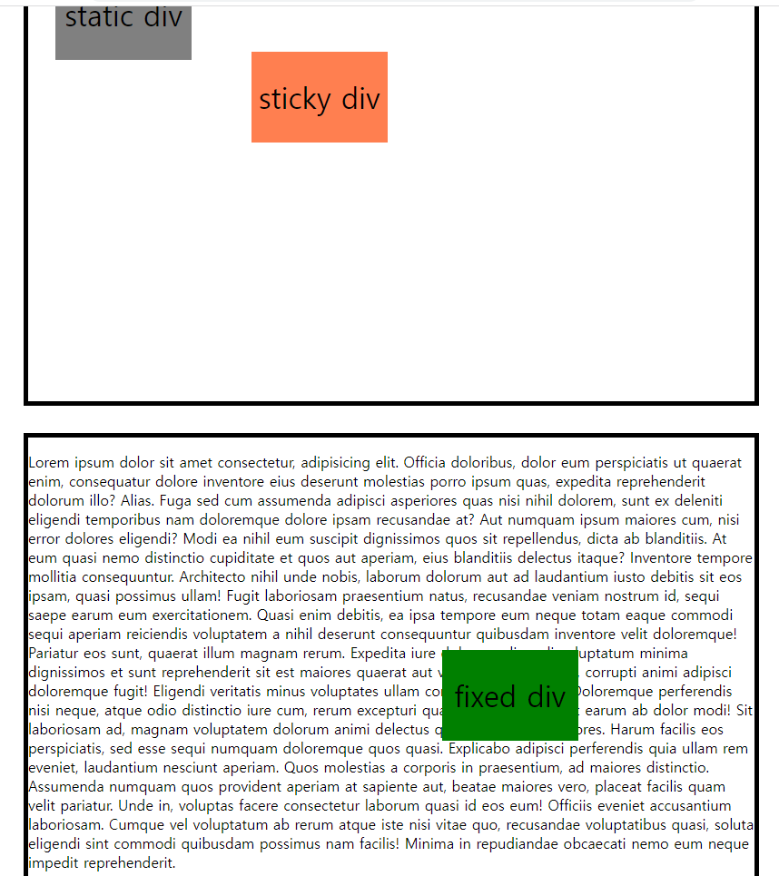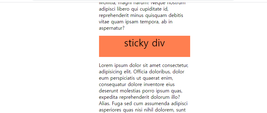- fixed 포지션과 유사하지만 특정 뷰포트가 아닌 해당 엘리먼트를 포함하는 컨테이닝 블록(containing block)에 대한 상대적(relative) 위치에 배치됩니다.   (예시 : html, body, div 등)