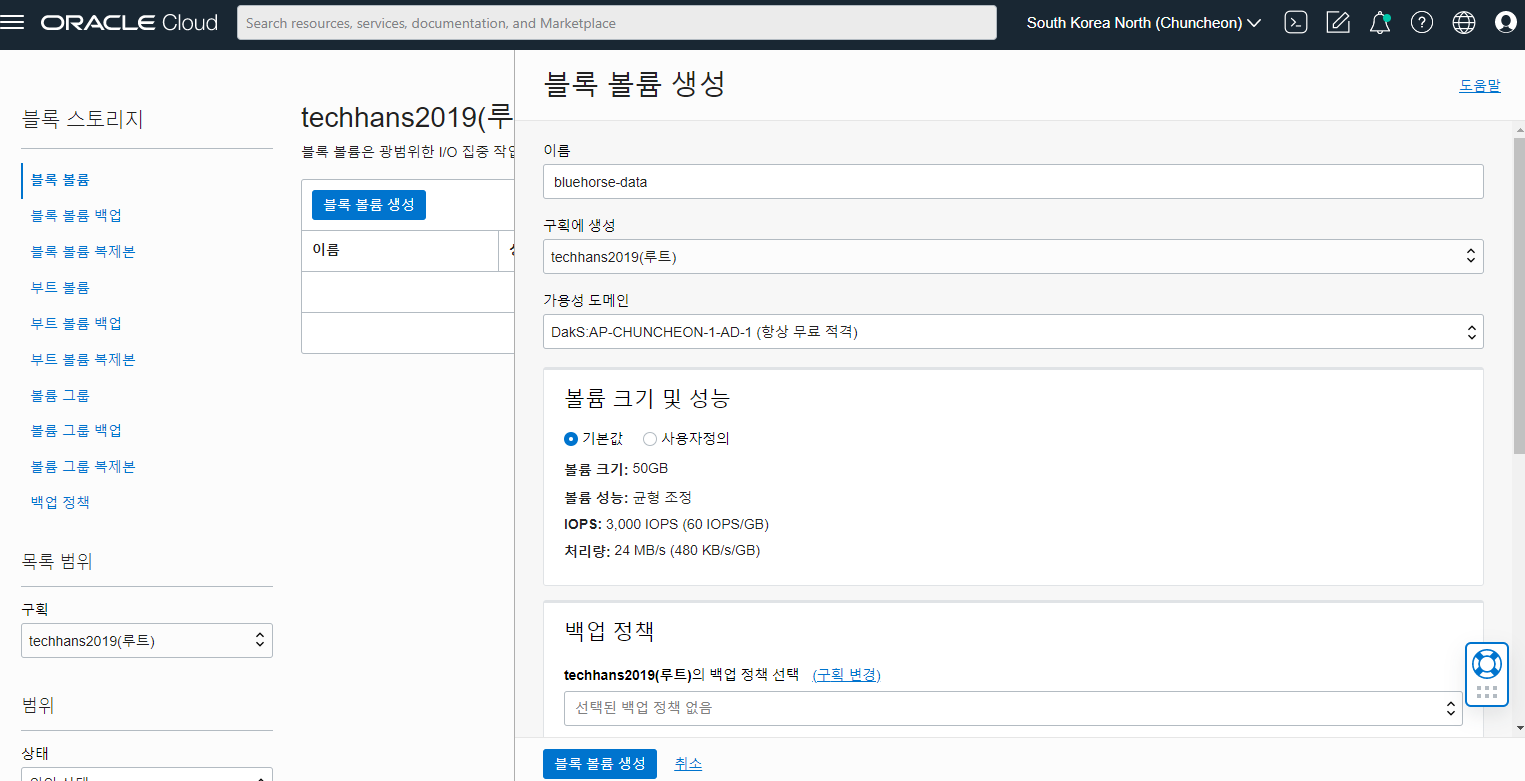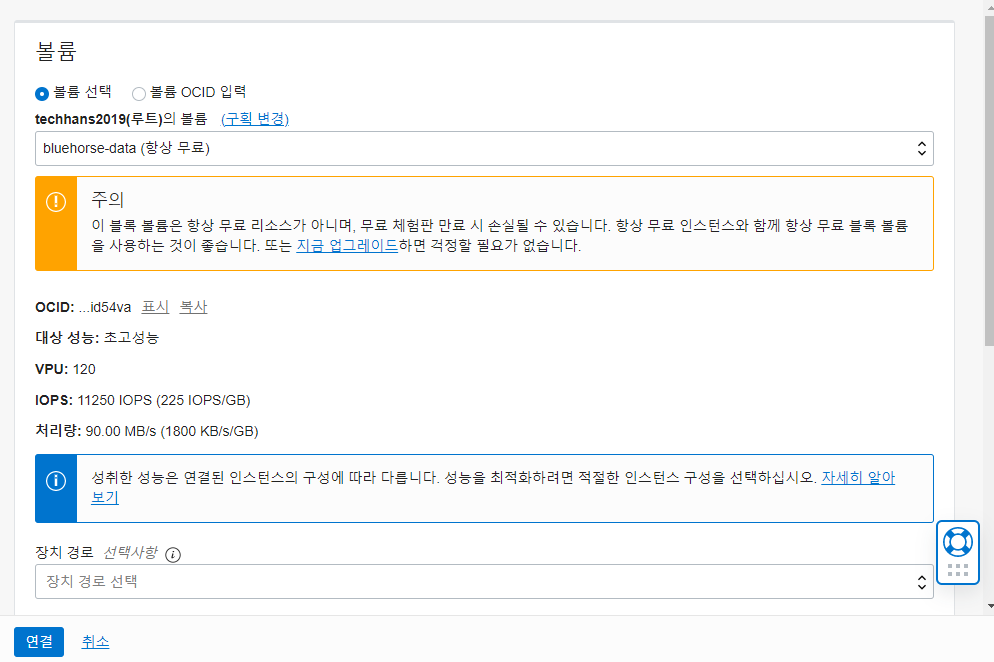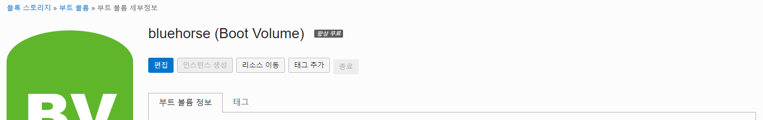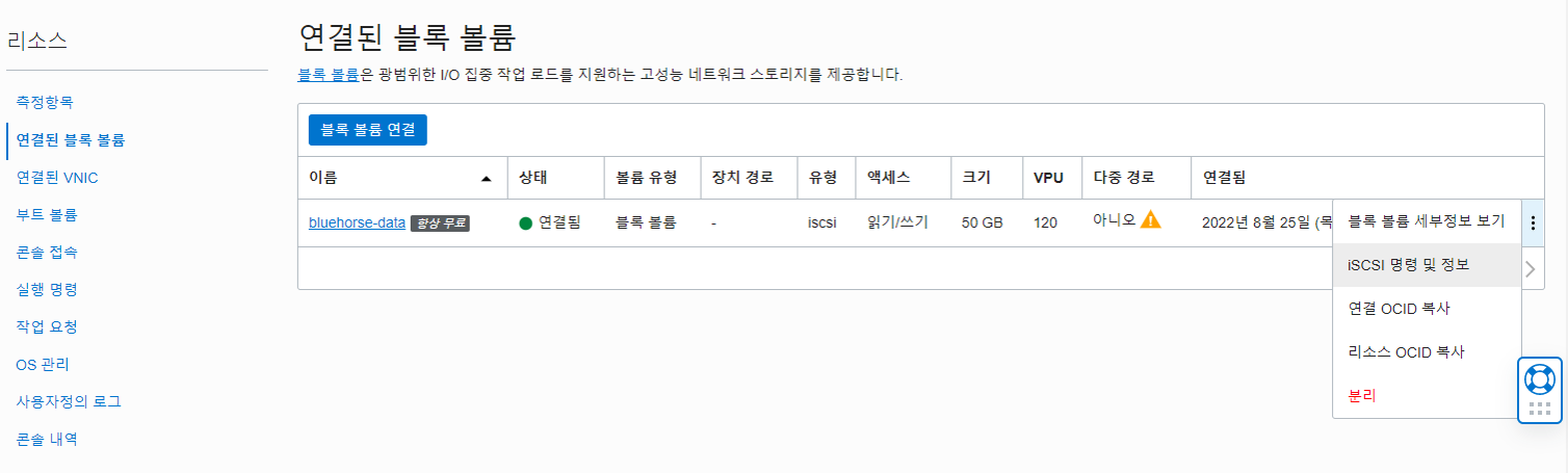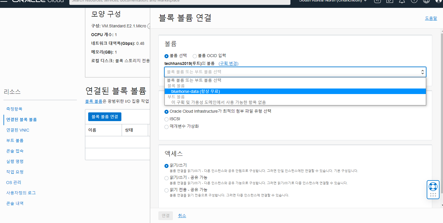 제가 사용하는 인스턴스 2개 중 하나인 bluehorse VM에 블록볼륨을 붙여보았습니다.