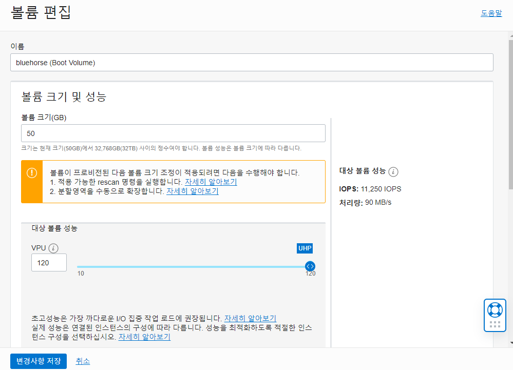 다시 메인메뉴>>인스턴스>>리소스>>부트볼륨으로 들어가 아이콘의 편집을 누르면 블록볼륨처럼 VPU를 늘리는