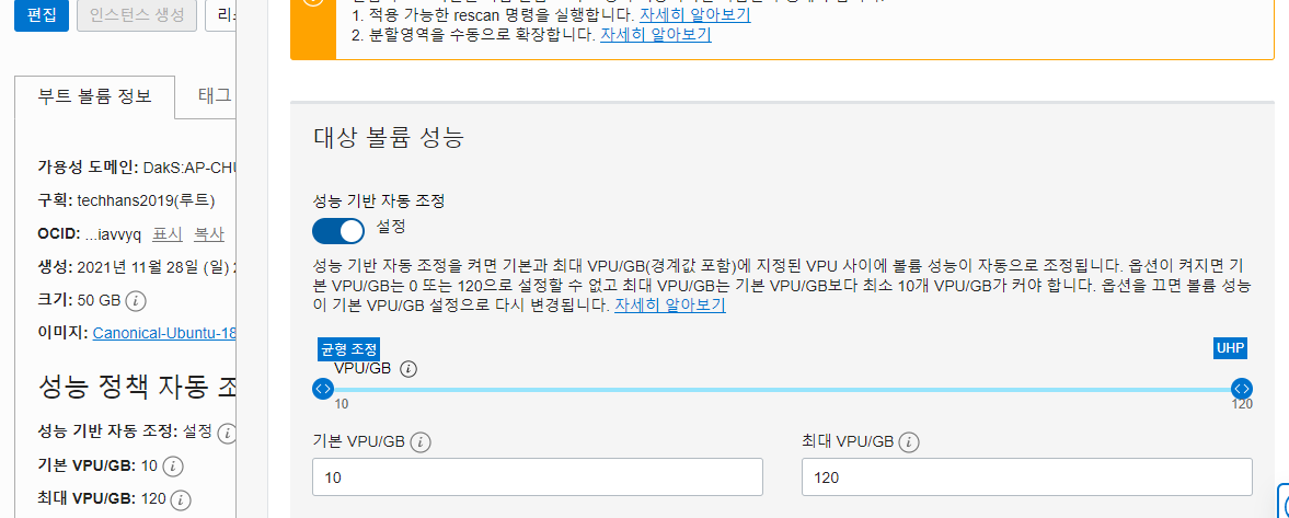 자세히 보면 VM 인스턴스를 최초 만들때 설정하는 부트볼륨에도 이 VPU를 설정할 수 있습니다.