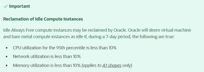 (참고) 오라클클라우드도 사용률이 아래 기준으로 떨어지면 해당 인스턴스를 회수 당하거나 운영중인 인스턴스가 STOP 되기도 한다. 기준은 아래와 같이 각 리소스가 10%를 넘기는 사용률이 되어야 회수 당하지 않는다 (amd, arm 공통사항)