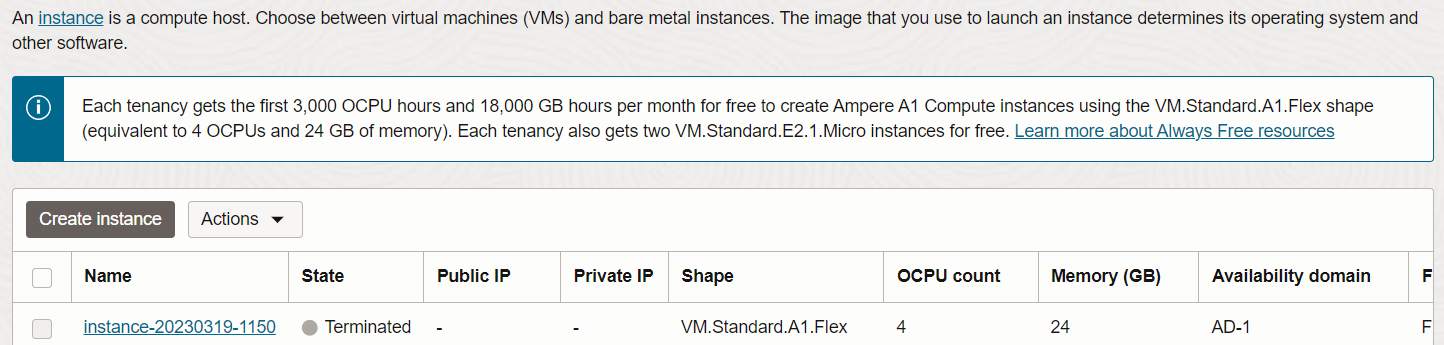 - Ameper A1 기반 VM 인스턴스 1개 (4CPU, 24G 메모리) : 이것은 평생무료 보장은 선전하지 않음